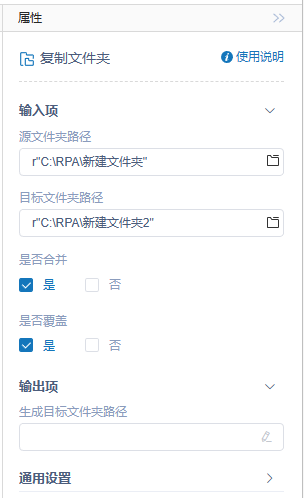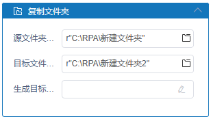 可选项,如果填写变量,运行后,该变量值则为复制后文件全路径,例如:C:\RPA\新建文件夹2\新建文件夹