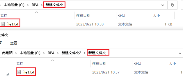 将"C\RPA\新建文件夹"中的"file1.txt"文件夹复制到"C\RPA\新建文件夹2"文件夹下