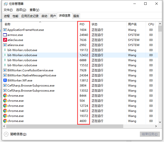 进程的ID号,在Windows下可直接通过任务管理器进行查询,如图: