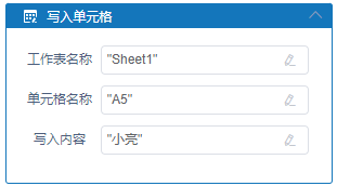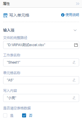 执行逻辑:RPA查找文件的完整路径对应的Excel文件,通过设置的工作表名称和单元格名称,定位到对应的单元格,将待写入内容进行写入,在写入前根据是否清空表格数据的选项\"是\"和"否"选择是否在写入前把excel文件中所有的数据都清空
