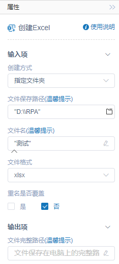 当"创建方式"选择"全路径"时显现,指创建的Excel工作簿保存的完整路径,需包含文件夹、文件名以及文件格式,如:\"D:\\RPA\\测试excel.xlsx\"