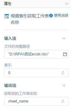 执行逻辑:RPA读取文件的完整路径对应的Excel文件,获取索引值,将获取到的工作表名称输出。