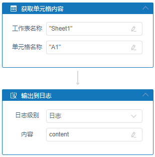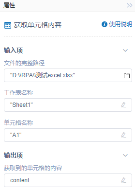 执行逻辑:RPA读取文件的完整路径对应的Excel文件,通过设置的工作表名称单元格名称,将获取内容传递到获取到的单元格的内容