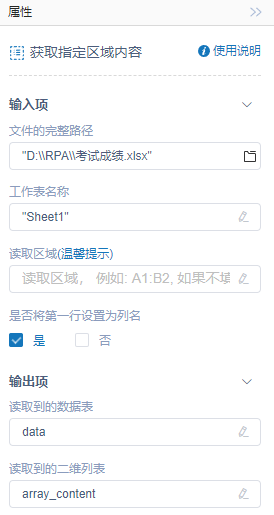 执行逻辑:RPA读取文件的完整路径对应的Excel文件,通过设置的工作表名称和读取区域,将指定区域的内容进行读取,并传递至读取到的数据表或读取到的二维列表中,同时如果将内容读取到数据表中时,可以选择是否将第一行设置为列名。