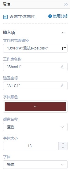 执行逻辑:RPA查找文件的完整路径对应的Excel文件,通过设置的工作表名称和选区坐标,定位到待操作的区域范围,读取设置的字体颜色或者颜色名称、字体大小和字体样式,进行设置