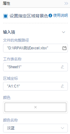 执行逻辑:RPA查找文件的完整路径对应的Excel文件,通过设置的工作表名称区域坐标,定位到待操作的区域范围,读取设置的颜色或者颜色名称,进行设置区域内单元格的颜色