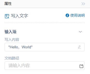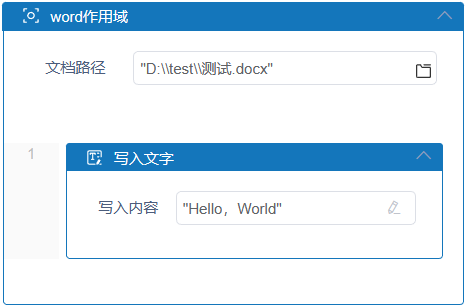 该活动需与其他Word相关活动组合使用,比如"插入回车"、"插入表格"、"写入文字"等,在此以"word作用域"+"写入文字"活动组合示例:
