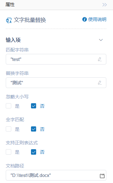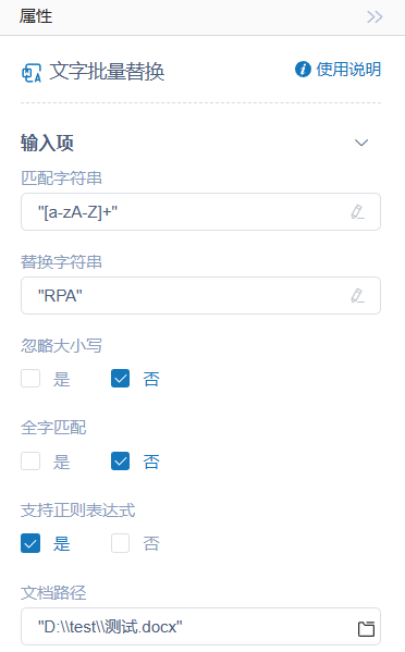 执行逻辑:RPA找到文档路径对应的Word文档,并将文档中匹配字符串对应的文字批量替换为替换字符串对应的文字,在文字替换的过程中,支持选择是否忽略大小写、全字匹配、支持正则表达式