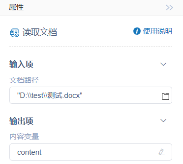 执行逻辑:RPA读取文档路径对应的Word文档,读取该文档中的内容,并将文档内容输出至内容变量中