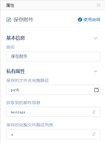 用【获取邮件】组件获取到邮件变量信息,将变量输入到【保存附件】组件中,并设置储存位置,即可完成保存附件动作