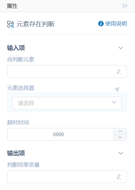 执行逻辑:RPA通过输入项中待操作元素或者元素选择器选择的元素,获取该元素存在状态返回给输出项中设置的布尔值变量中