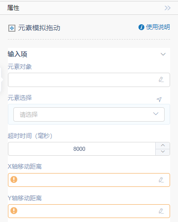 当前活动组件是在界面自动化使用场景下使用,其核心操作目标是元素对象,所以像操作客户端界面,浏览器页面等,必须使界面展示出来方可,否则必定报错;元素操作成功的关键是,移动距离的准确度,需要多次尝试来确定X、Y方向移动距离的像素值,也可以使用其他工具或者脚本来计算目标拖动距离