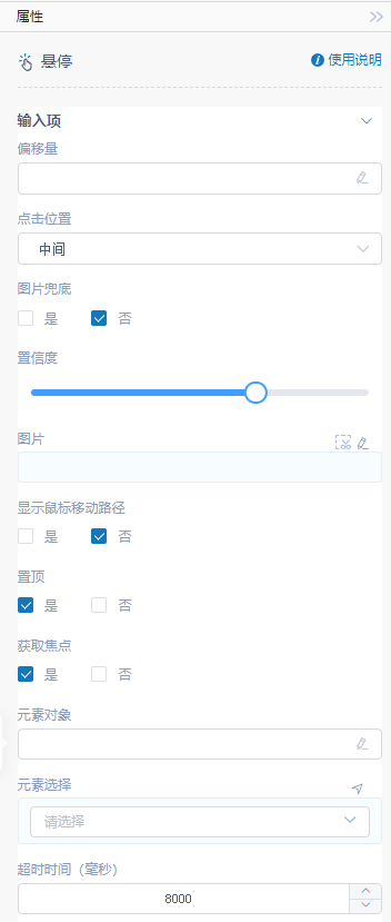 执行逻辑:RPA在待操作元素或者元素选择器选择的元素,通过配置相应置顶窗口获取焦点超时时间等设置,模拟用户将鼠标光标停留在某个界面元素上,而不进行点击或其他操作,通常会触发一些特定的效果或显示相关信息