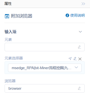 该活动在"附加浏览器"和"打开网页"活动范围内操作时,"浏览器"属性可以无需再使用变量进行指定