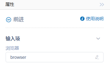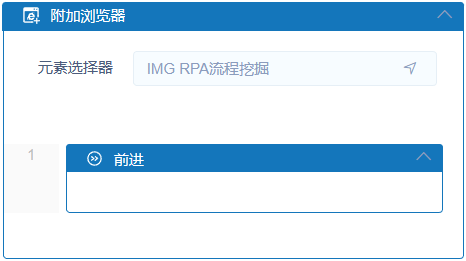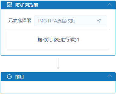 "前进"活动中的浏览器变量,一般通过"打开网页"或"附加浏览器"活动声明,在此以"附加浏览器"+"前进"活动组合示例: