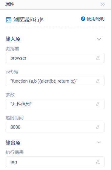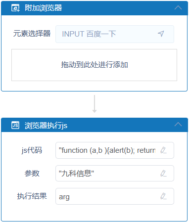 执行逻辑:RPA通过浏览器变量中的元素对象定位到目标网页,在该网页中根据js代码和参数执行JavaScript脚本