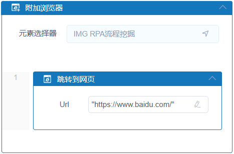 "跳转到网页"活动中的浏览器变量,一般通过"打开网页"或"附加浏览器"活动声明,在此以"附加浏览器"+"跳转到网页"活动组合示例:
