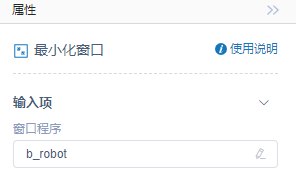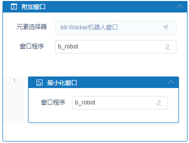 执行逻辑:获取到指定窗口后,将该窗口最小化,可将活动直接拖拽进附加窗口活动中,也可以使用窗口程序变量指定要获取信息的窗口