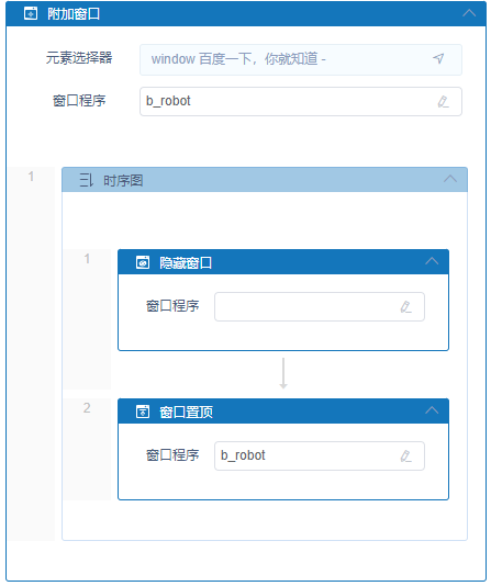 使用【附加窗口】活动获取窗口后,用【隐藏窗口】活动将窗口隐藏,然后使用【窗口置顶】活动置顶窗口