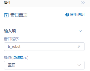 执行逻辑:获取到指定窗口后,将该窗口置顶或取消置顶,可将活动直接拖拽进附加窗口活动中,也可以使用窗口程序变量指定要获取信息的窗口