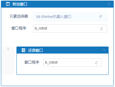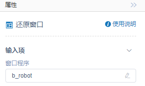 执行逻辑:获取到指定窗口后,将该窗口还原,可将活动直接拖拽进附加窗口活动中,也可以使用窗口程序变量指定要获取信息的窗口