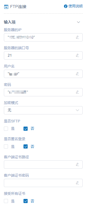 - 在"FTP连接"活动输入项属性中输入服务器IP、用户名、密码