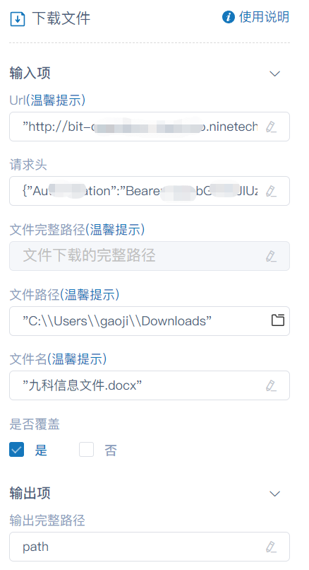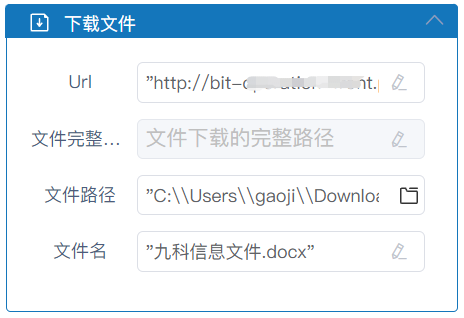 "下载文件"活动可通过输入url地址+Cookie下载对应的文件(非鉴权地址可不需要Cookie),可自定义文件名,"完整路径"与"文件路径"输入互斥