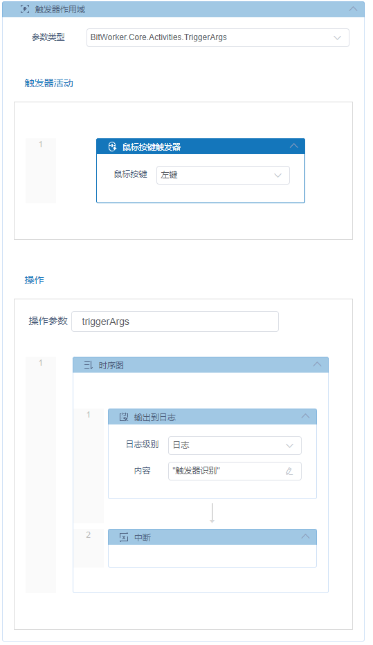 识别鼠标左键被单击后,再执行【输出到日志】活动