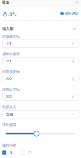 执行逻辑:运行该活动,鼠标将会模拟左键、右键或者滚轮选中输入的起始横坐标起始纵坐标位置拖动到结束横坐标、结束纵坐标的位置