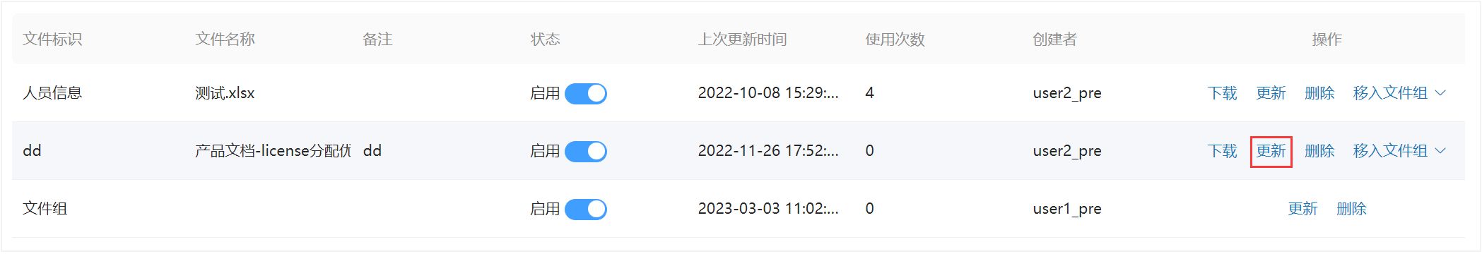 点击文件操作栏下的 「更新」 字样,即可对已有文件,进行更新操作,支持更新文件的文件标识源文件备注人员范围