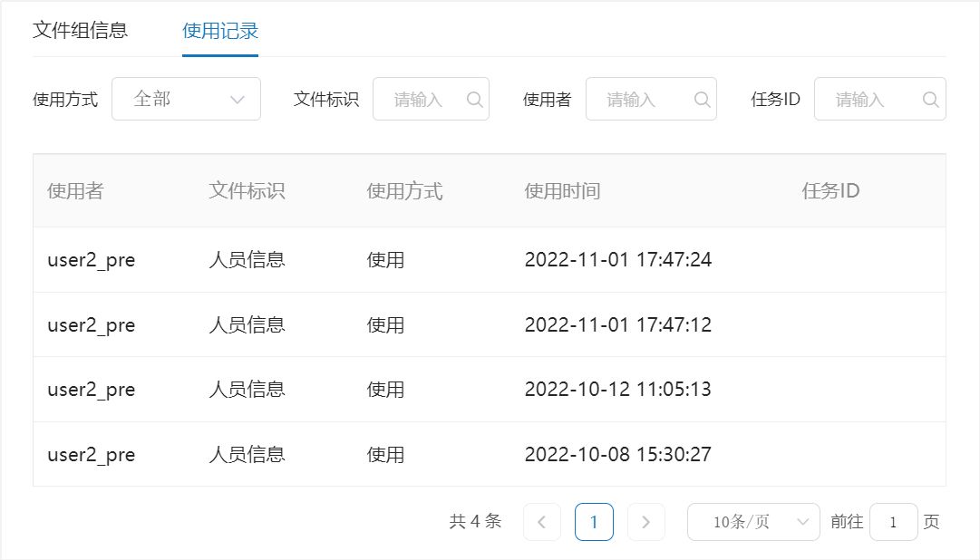 • 使用记录中展示项为:使用者、文件标识、使用方式、使用时间、任务ID。