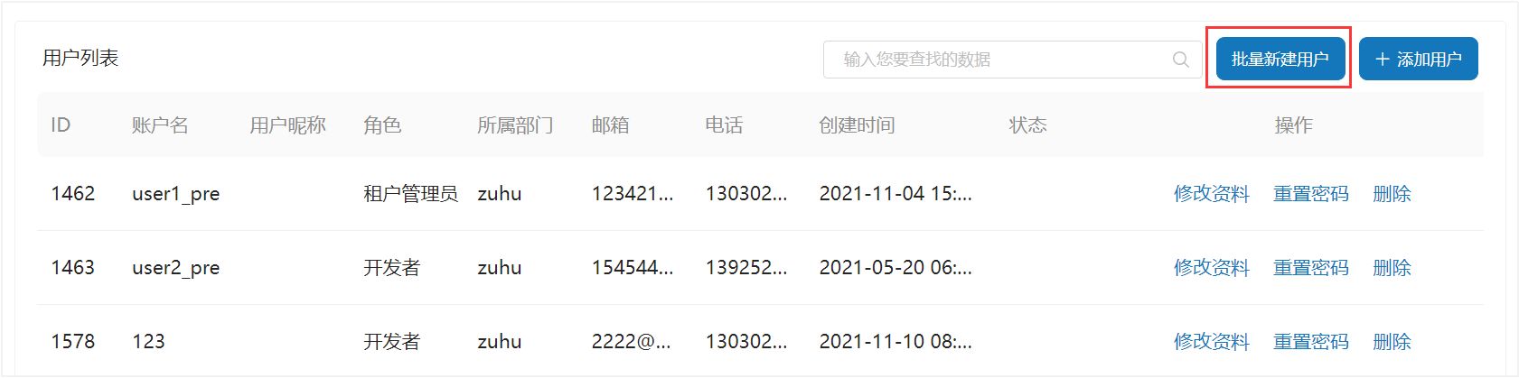 点击用户列表右上角的 「批量新建用户」 按钮,即可打开批量新建用户窗口。