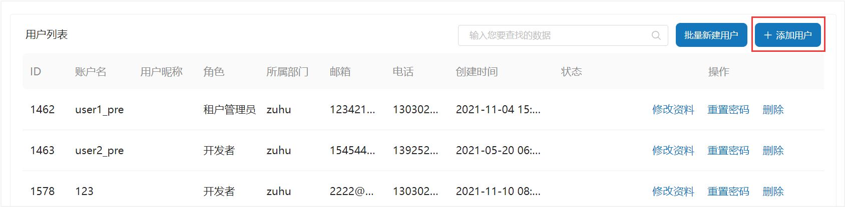 租户管理员可通过用户列表中的操作栏,对已经添加的用户,进行修改资料重置密码删除操作;