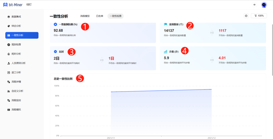根据流程模型进行一致性检查,并展示相关数据,帮助企业定位不一致情况:
