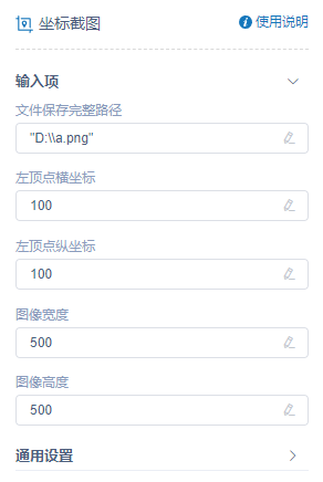 在指定的横纵坐标处进行截图,并指定图像的宽和高,然后将图片文件输出到路径中。图像输出路径需要填写文件名+后缀。该活动受电脑分辨率影响,若电脑分辨率发生了变化,需要响应修改横纵坐标和图像大小。