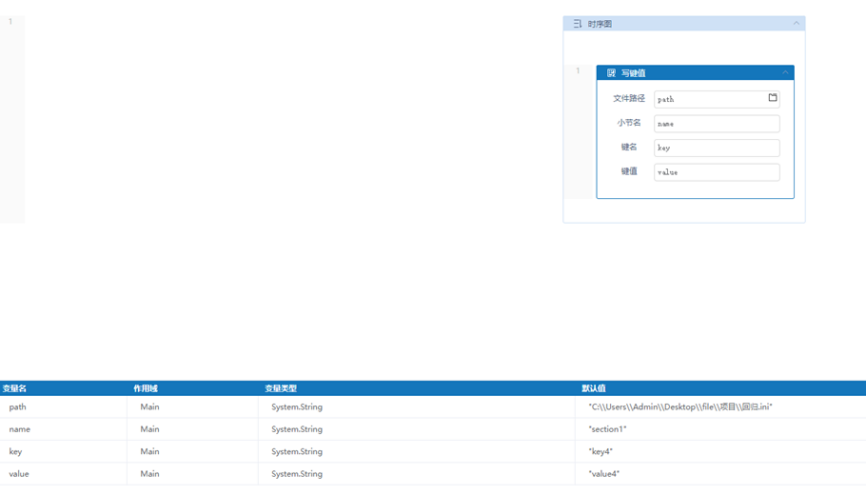执行逻辑:输入指定的".ini"文件的绝对路径,并输入该".ini"文件的小节名、键名,将获取到的".ini"文件中的某个小节下的键对应的值输出为变量