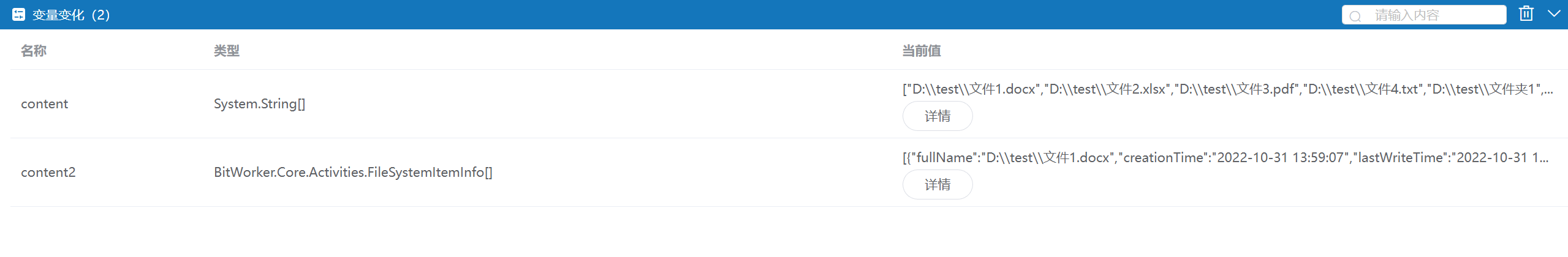 输出变量,包含指定文件夹下的文件名、文件创建时间、文件修改时间、文件大小等信息