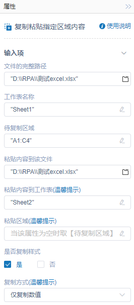 执行逻辑:RPA读取文件的完整路径对应的Excel文件,通过设置的工作表名称和待复制区域,获取待复制的内容,然后再读取粘贴内容到该文件对应的Excel文件,查找需要粘贴内容到工作表,然后读取粘贴区域,在粘贴时判断是否需要复制样式和复制方式,将待复制内容进行粘贴。