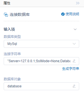 执行逻辑:选择想要连接数据库的数据库类型,在连接字符串中正确输入数据库的连接信息(可通过点击生成字符串按钮,以键值的形式输入信息,更加直观),可设置数据库对象并保存于变量中,方便在之后的流程中对已连接的数据库进行调用