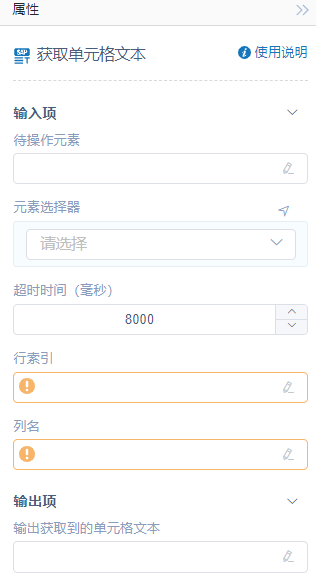 执行逻辑:RPA在待操作元素或者元素选择器选择的元素,设置行索引和列名,模拟用户获取并输出获取到的单元格文本至内容变量
