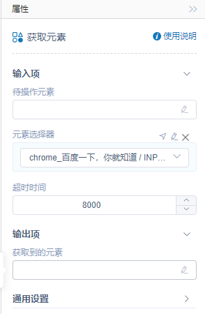 执行逻辑:RPA通过输入项中待操作元素或者元素选择器选择的元素,获取该元素的所有属性值并将结果返回给输出项中获取到的元素变量中