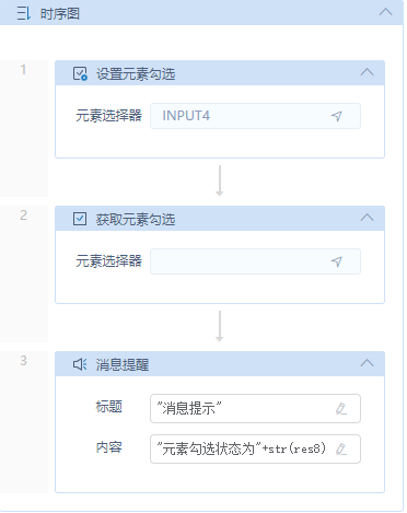 执行逻辑:选择【设置元素勾选】活动,将元素状态设置为勾选/不勾选,再用【获取元素勾选】,将元素是否勾选的值输出给变量,供后续流程使用