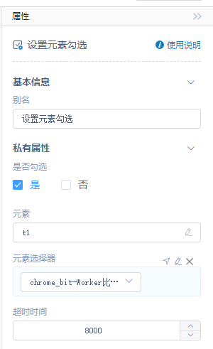 待设置勾选的元素。该变量值为空时,则元素选择器选择的元素输出至该变量,后续流程可直接调用该变量