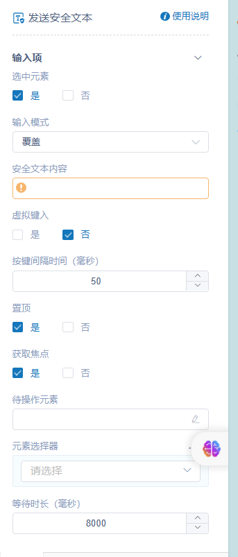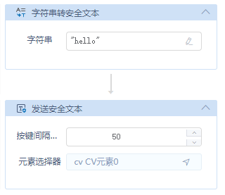 执行逻辑:安全文本只能输入需要配合【符串转安全文本】组件,将【符串转安全文本】的值填入到安全文本内容然后设置需要发送的元素位置,点击运行向元素发送安全文本信息