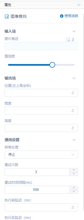 执行逻辑:选择【图像查找】活动,选择图片集的图片或者屏幕截图,将图片的坐标、宽度、高度输出至变量,供后续流程使用。