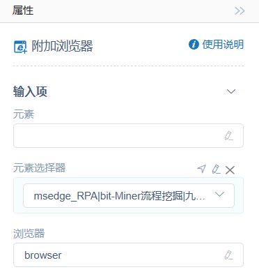 该活动在"附加浏览器"和"打开网页"活动范围内操作时,"浏览器"属性可以无需再使用变量进行指定