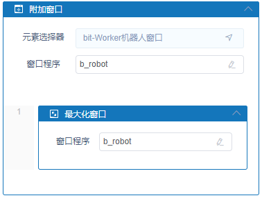 执行逻辑:获取到指定窗口后,将该窗口最大化,可将活动直接拖拽进附加窗口活动中,也可以使用窗口程序变量指定要获取信息的窗口