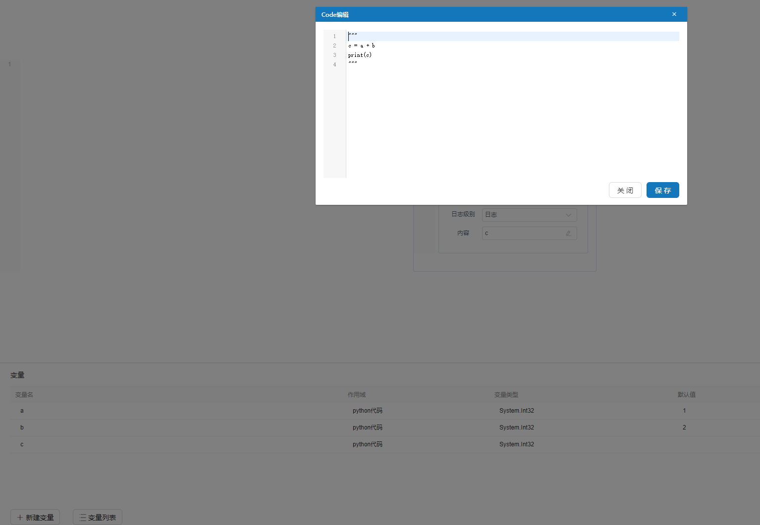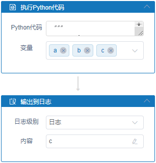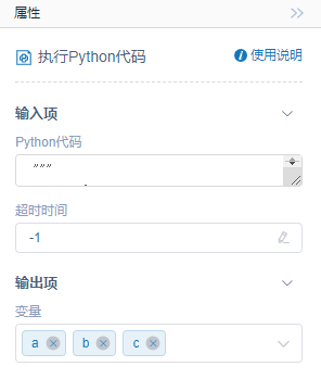 Python代码中所需的输出、输入变量,作为输出变量时,后续流程可直接调用该变量。该属性为非必填