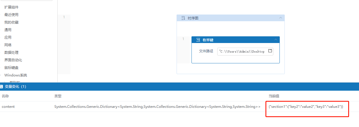 运行该工程,会找到指定的".ini"文件的绝对路径,并获取该".ini"文件的所有内容,并赋值给变量(获取的内容)