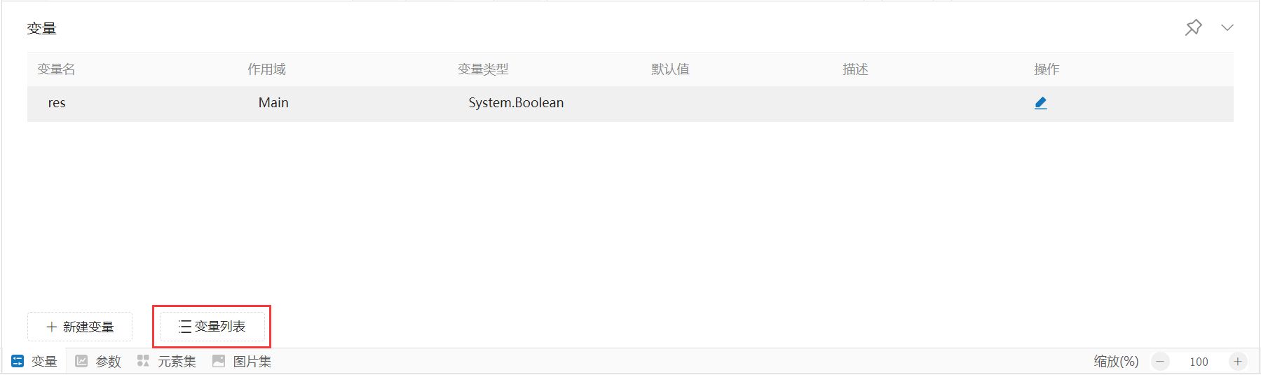 点击变量栏中的 「变量列表」 按钮,可以打开当前流程的变量列表,列表中展示了当前流程中的所有变量。